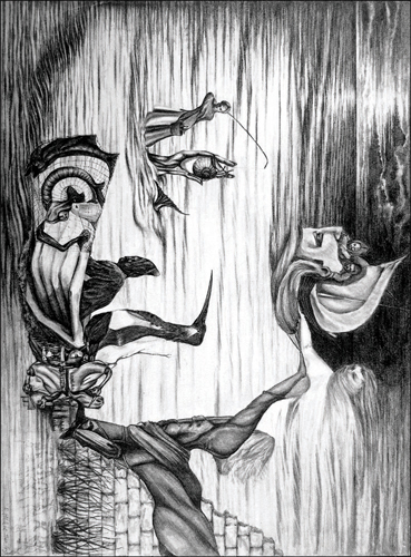 Original oeuvre created in homage to Salvador Dali in reference to a vision of the Master of Surrealism: in the Thirties, at the time of a voyage in Africa, André Breton sends to Dali a postcard in black and white representing an indigenous village. Holding the card in the wrong way, Dali sees there appearing a "hidden" face that it transcribes and draws. Using again the same principle with the portrait of the Master, and strongly inspired at that time by The Lord of Rings by Tolkien, Richard MERIC created this drawing using the paranoia-critical method.